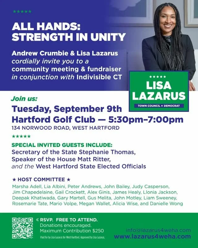 A lifelong Democrat, Lisa has supported, volunteered and fundraised for various campaigns including U.S. Senator Chris Murphy, Connecticut Secretary of State Stephanie Thomas, Hartford Mayor Arunan Arulampalam, New Haven Mayor Justin Elicker, and West Hartford Councilwoman Carol Blanks. She has also served on the West Hartford Board of Assessment Appeals and as an alternate on the Zoning Board of Appeals.